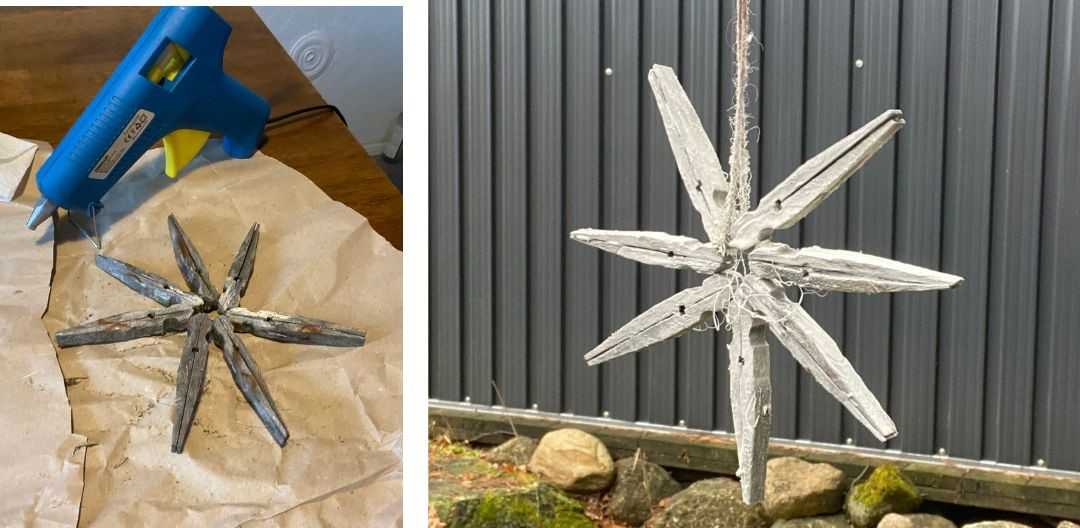 Dve polovice štipca zlepte chrbtom k sebe pomocou tavnej pištole. Takto si pripravte všetky ramená hviezdy.