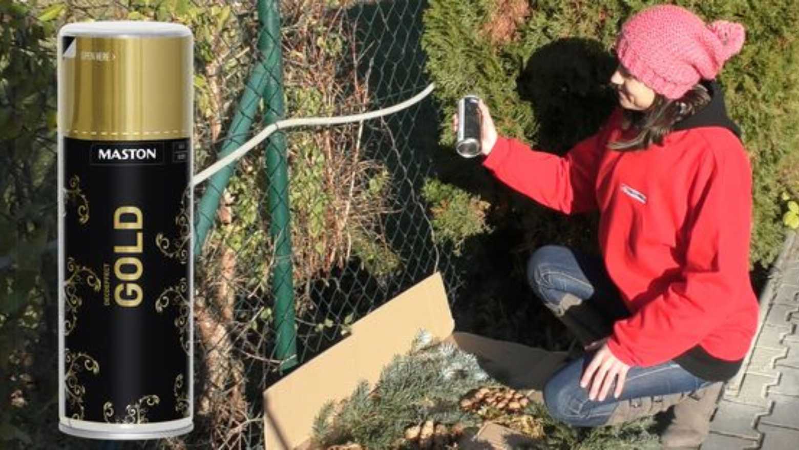 Rovnakým spôsobom môžete doma nastriekať aj šišky či vetvičky s lístkami. Doma ich zbavte všetkých nečistôt. Môžete ich napr. umyť vodou, len pozor, šišky sa po umytí zatvoria. Keď úplne vyschnú, zas sa otvoria a tvorenie sa môže začať! Stačí ich prichytiť na drievko či špajľu a opatrne nastriekať dekoračným sprejom Maston vo vami zvolenom odtieni.